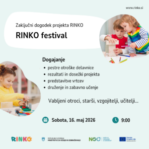 Z veseljem vas vabimo na RINKO festival, posebni dogodek, ki združuje ustvarjalnost, igro in strokovno izmenjavo med vrtci, vzgojitelji ter otroki. Gre za edinstveno priložnost, da predstavimo delo, ki je nastajalo skozi projekt RINKO, ter skupaj ustvarimo dan navdiha in povezovanja.
